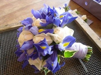 - Попросить флориста тейпировать стебли растений. Это обеспечит длительное сохранение ирисов, позволит невесте не беспокоиться о том, чтобы иметь при себе воду для подпитки свадебного атрибута.