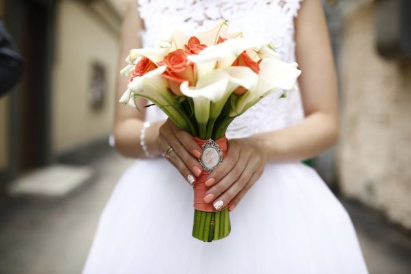 Для тёплого осеннего варианта это может быть сочетание оранжевых калл, декоративной зелёной гвоздики, брунию за её серебристый оттенок, крупные белые розы и несколько веточек кустовой кремовой розы. Очень интересное сочетание своей яркостью и при этом нежностью.