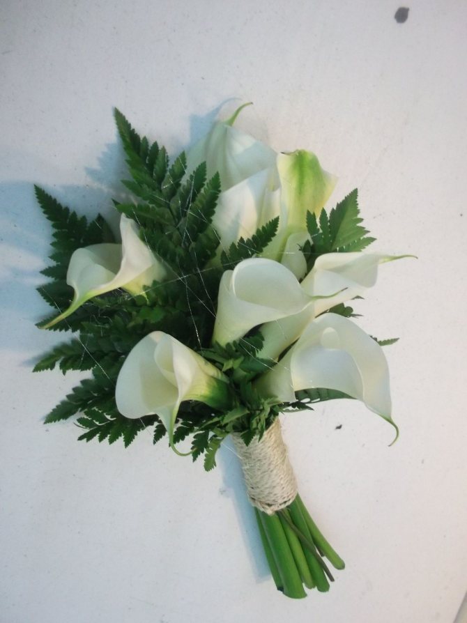 Важно! Из калл создают букеты любых форм, кроме корзинки. Она единственная выглядит странно.