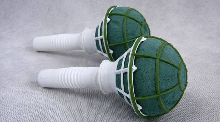 - Для этого внутрь ее сетки уложите специальную прокладку («оазис»), напитанную водой – углубленные в нее цветы продержатся дольше. Верхнюю часть портбукетницы скрепите с нижней частью проволокой. Нижнюю часть обмотайте двухсторонним скотчем, завуалируйте листьями аспидистра.