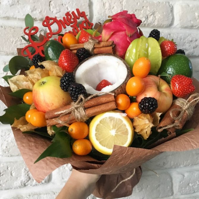 Найти свою интересную идею помогут фото букетов из фруктов. Не стоит использовать переспевшие плоды. Лучше выбирать экземпляры без видимых дефектов.