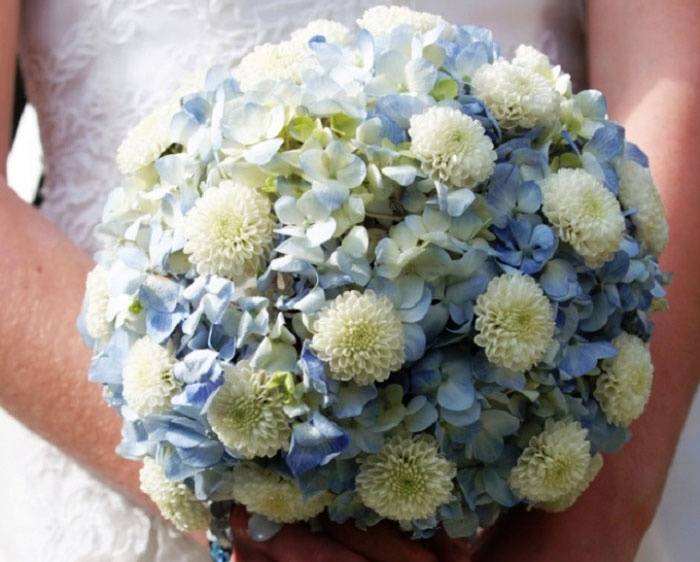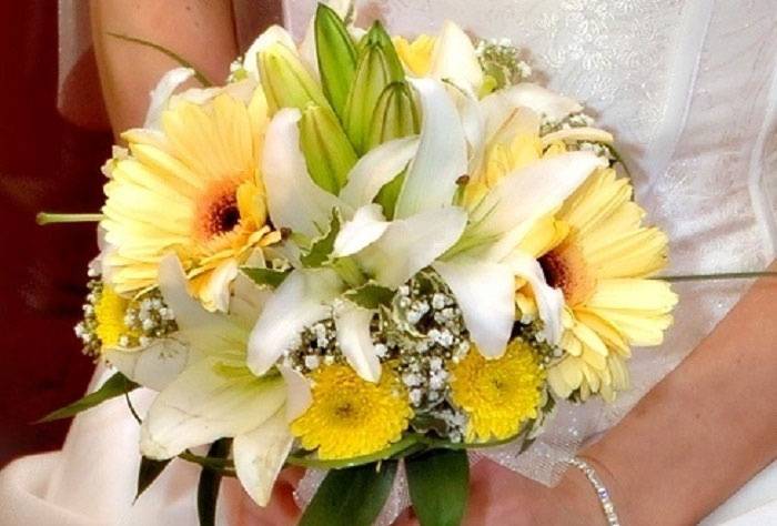 Букет с вплетенными в него помимо лилий хризантемами тоже символичен. Эти цветы у разных народов олицетворяют знатность, глубокие эстетические переживания, любовь. Белоснежная композиция будет разбавлена за счет вкрапления мелких цветков, что сделает ее более динамичной, душевной, не такой вычурной. Чтобы добавить нежности в образ невесты, их вплетают нижним ярусом, центровую часть оставляют во владении лилий. Такие букеты будут удачно смотреться с различными украшениями: блестками, лентами, декоративными сетками, кристаллами, фоновыми цветами.
