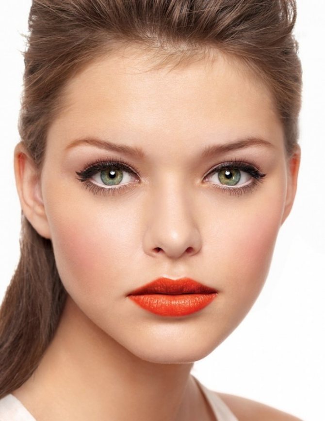 Даже если вы решили использовать помаду темного и насыщенного цвета, не переусердствуйте с яркостью губ – такие оттенки в случае с зеленоглазыми девушками могут разрушить образ невинной и прекрасной невесты. Если вы хотите скорректировать форму губ, используйте карандаш. Он должен быть на тон темнее, чем помада.