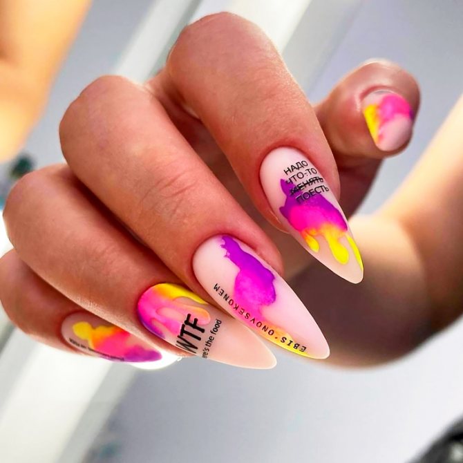 Выражение хромотичности через дизайн в форме миндаль не испортит образ и макияж. Яркие цвета не подойдут на маленькую длину, так как станут неуместными пятнами и не могут вместить дополнительные элементы декорирования.