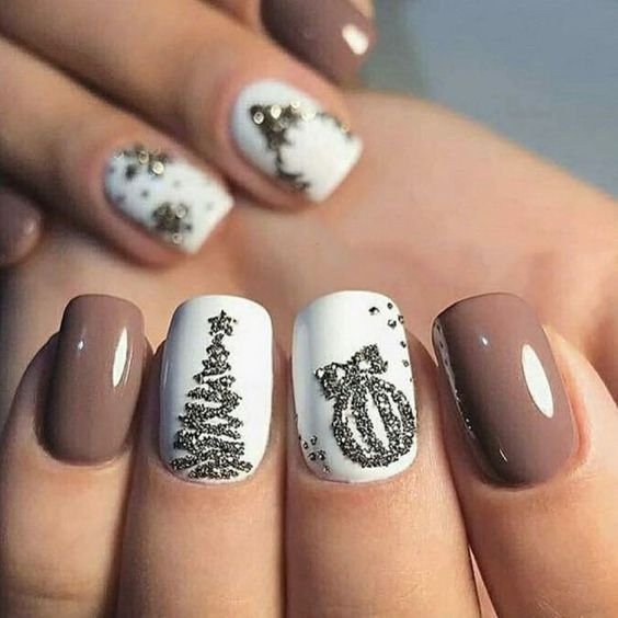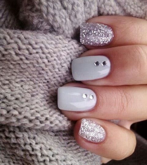 Можно украсить маникюр только золотыми или серебряными стразами и блестками.