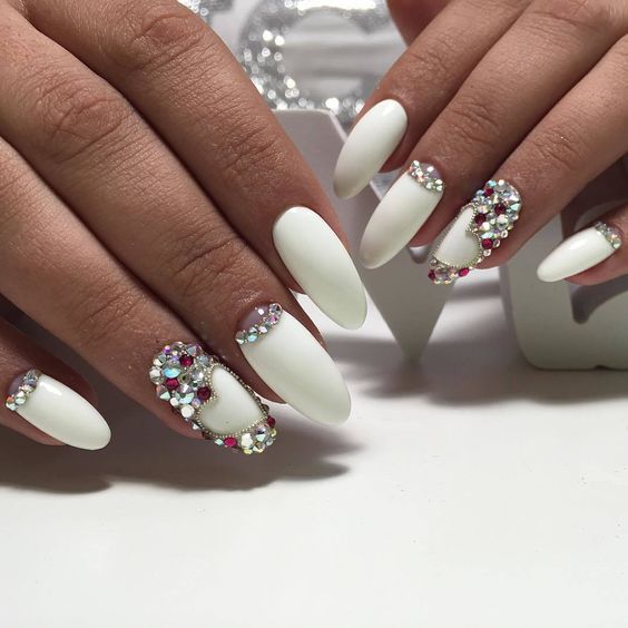 Белый праздничный маникюр с лепкой, выглядящий дорого