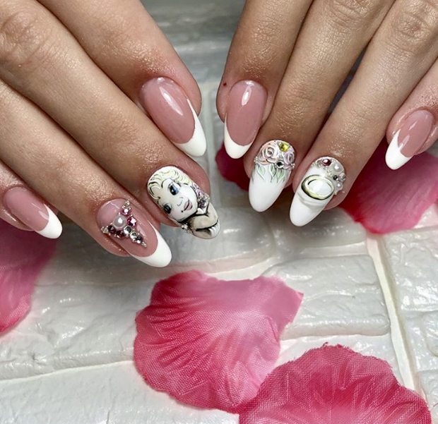 Также, очень красиво смотрится белый френч, если он нанесен на пастельного цвета основу, и украшен стразами, кружевами или рисунками цветов.