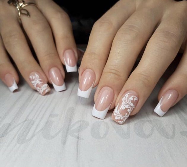 Многие совершают французский маникюр и украшают его красивыми узорами. Такими узорами могут быть абстрактные завитушки или красивые цветы. Чаще всего это розы, изображенные в белой или светлых цветовых гаммах.