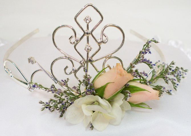 - Диадема может быть украшена живыми цветами (одним большим бутоном или парой маленьких).