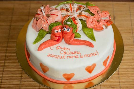 В особенности будет здорово, если гостям эти сценки, отображенные на десерте, будут знакомы. Если супруги считают себя неплохими кулинарами, то они такой торт могут создать самостоятельно, а когда никаких навыков выпечки нет, лучше заказать праздничное угощение у кондитеров. Мастерам выпечки можно в деталях рассказать о своей идее, обрисовать то, каким хотелось бы видеть юбилейный торт.