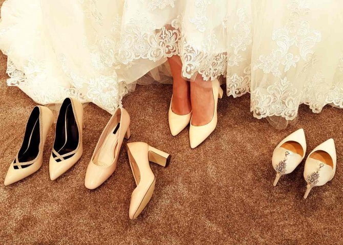 - длительность нахождения на ногах (если предполагается активный день со множеством мероприятий и фотосессией в нескольких местах, возможно, следует выбрать туфли на среднем каблуке или низкие лодочки);