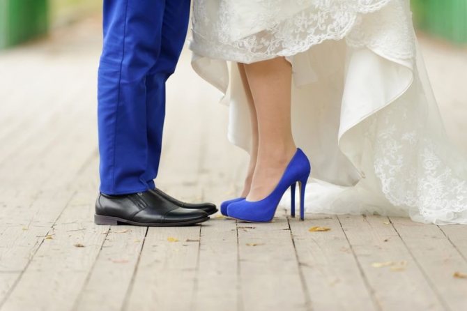 Синяя обувь считается традиционно летним вариантом, и туфли такого цвета, как и голубые, подбираются, согласно ультрамодному тренду, под галстук или костюм жениха.