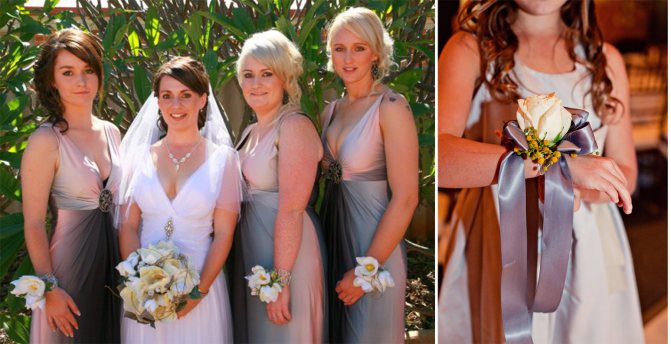 Маленький букетик на запястье подружек невесты служит креативным украшением образа девушек