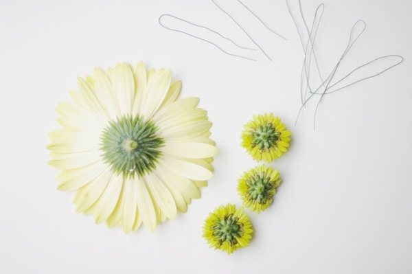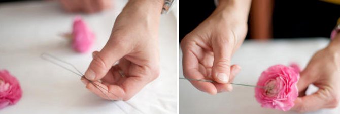 Затем, готовим цветок. Возьмем тонкую проволоку, согнем ее петлей так, чтобы можно было провести ее сквозь бутон в центр стебля.
