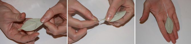 Понадобятся листья для декорирования цветочного браслета. Делаем маленький стежок проволокой чуть выше середины листочка, пускаем проволоку по листу и скручиваем у черенка. Обматываем тэйп лентой.