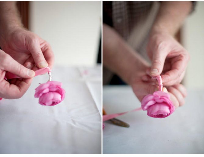 В итоге должна образоваться изысканная роза, которую следует прикрепить к ленте из атласа. Ее длина обязана позволить завязать браслет на крупный бант.