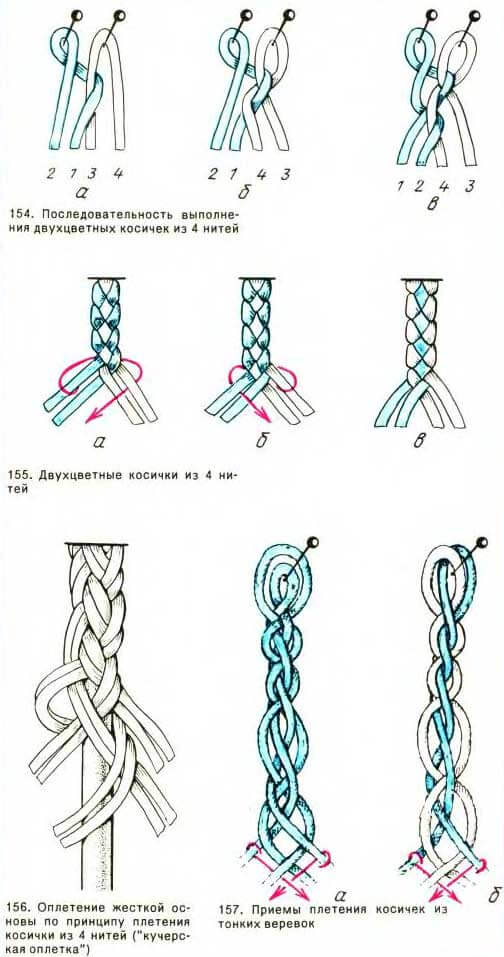 Возьмите 2 нити длиной по 1 м.: 1 темную и 1 светлую. Закрепите булавками таким образом: 2 темные слева, 2 светлые справа. Обогните первой нитью снизу третью нить и присоедините первую нить к второй (рисунок 154, а). Далее, четвёртой обогните снизу первую и соедините четвертую к третьей (рис. 154, б). Далее, плести снова крайней левой ниткой (рисунок 154, в). И так работайте дальше, и у вас получится фенечка с тёмной окантовочкой (рисунок 155, а, б).