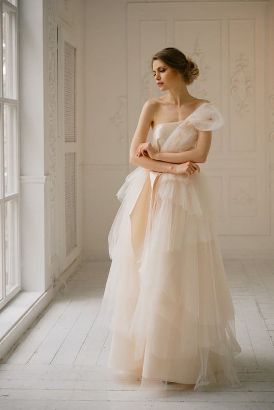В «тон» платью имеет смысл декорировать фату или диадему, подобрать серьги, колье, браслеты. Невесомый и воздушный образ невесты удачным образом дополнят простая нитка жемчуга или подвеска.