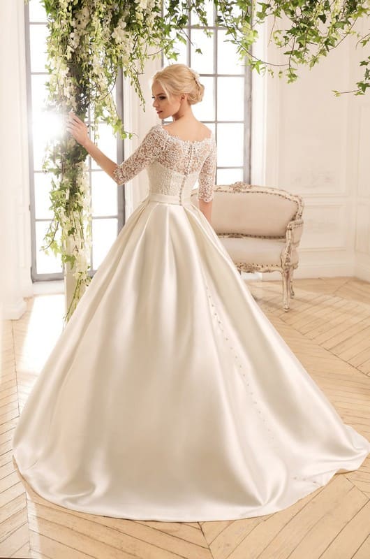 - Пышные модели в сочетании с жемчугом создают эффект легкости и волшебства. Жемчужный декор будет уместен в зоне декольте, в области корсета и на рукавах.