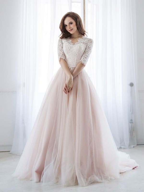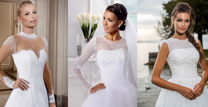 Перламутровые бусины способны преобразить наряд невесты, добавив ему торжественности и женственного шарма. Безошибочный образ можно сложить, выбирая классическое длинное свадебное платье с жемчугом на корсете или подоле и фату с россыпью мелких камней. Интересно будут смотреться закрытые целомудренные модели с рукавами до запястий и вырезом лодочкой.
