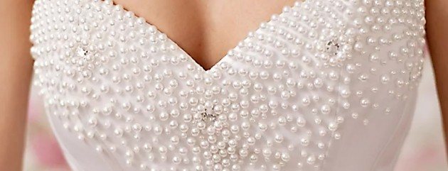 Свадебное платье, украшенное жемчугом или имитирующим его бисером, обычно выбирают для совсем юных невест. Однако, зрелые женщины и девушки, вступающих в брак повторно, также легко могут выбрать подобный наряд. Единственным условием уместности в таком случае станет деликатность вышивки и ее умеренность, также нежелательно сочетать в одном наряде перламутровые бусины и блестящие камни.