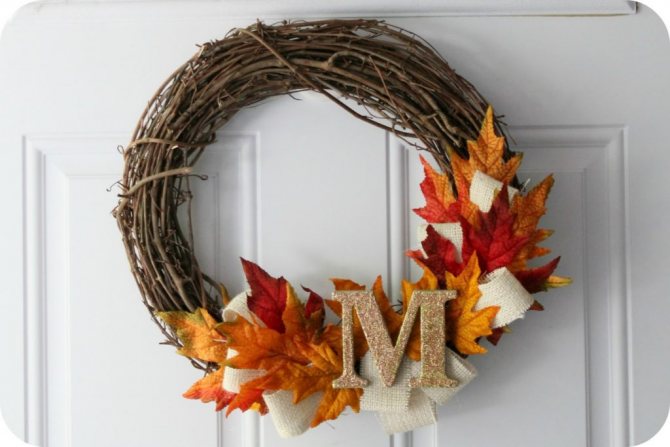 Если поделка будет использоваться как интерьерное украшение, то ленты привязывать не нужно. После закрепления декора основе придают круглую форму, ее концы скрепляют.