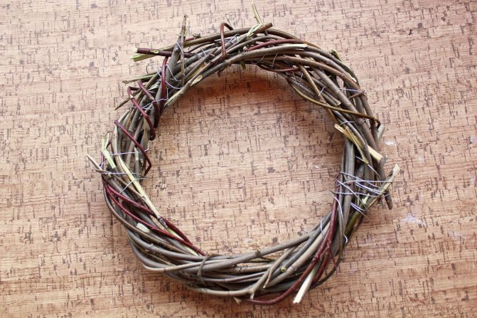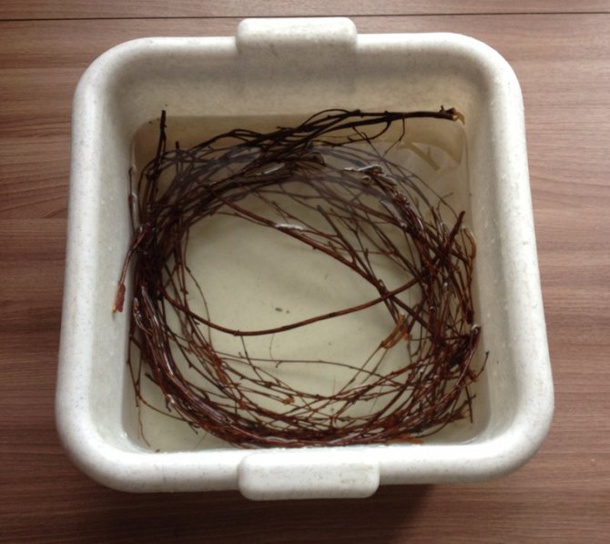 Для поделки лучше всего подходят ветки ивы, плакучей березы или винограда длиной около 80 см. Количество используемых веток зависит от того, какого объема будет венок. Если имеющийся материал гнется плохо, то его гибкость можно улучшить, замочив ветки на 30-40 мин. в кипятке.