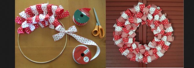 Еще один вариант венка, который легко сделать из проволочного кольца и лент. Для него потребуется кольцо-основа произвольного размера и ленты 2-3 расцветок, завязанные по всей окружности кольца в виде бантиков. Другие варианты венков из лент, которые легко сделает даже новичок, можно посмотреть на фото ниже.