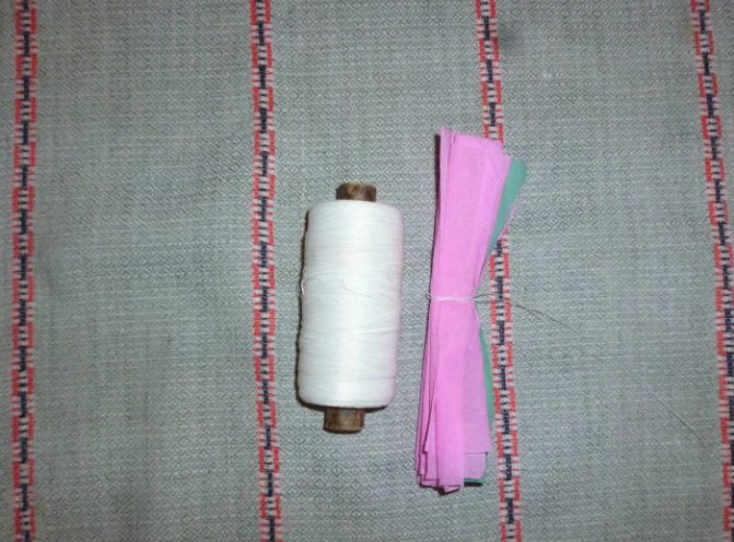 Процесс создания венка из бумаги начинается с изготовления цветов. Для этого гофрированную бумагу необходимо нарезать на прямоугольники 9×13 см. Для создания 1 цветка необходимо сложить вместе 2 зеленых прямоугольника, сверху добавить 8 розовых прямоугольников, затем всю стопку свернуть гармошкой, перевязать посредине ниткой, как это показано на фото ниже.