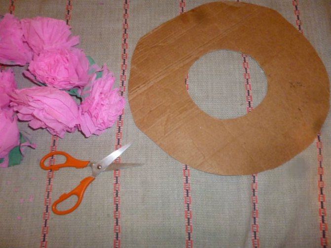 Концы бумажной заготовки обрезать полукругом. Сформировать объемный цветок, поднимая и расправляя лепестки. Повторяя вышеописанные действия, сделать 10 цветков. Вырезать из картона кольцо, которое станет основой венка.