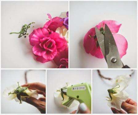 Далее можно приступать к сборке. Готовые стебли с цветами и листиками поочередно обернуть вокруг проволочного основания. Чем плотнее зафиксированы растения, тем красивее выглядит украшение. Сплетать лучше так, чтобы потом была возможность расправить каждый цветок.