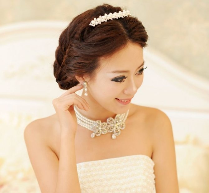 Кроме бокалов и наряда невесты украшают жемчужинами волосы. Даже скромная нитка жемчуга или небольшая диадема сделают образ законченным, не требуя дополнительных аксессуаров. Стилисты выделяют несколько вариантов причесок, лучше других гармонирующих с жемчужинами.