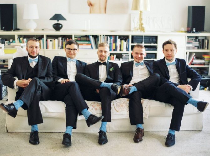 Обувь следует подбирать в тон наряду. Например, если выбран светлый костюм жениха, отличным решением станут бежевые туфли. Темная одежда гармонично смотрится с черной обувью. Естественно, что при этом также нужно подобрать подходящие носки. Они должны быть такого же цвета, что и наряд, выполнены в одном цвете.
