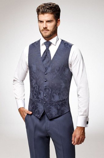 Фрак имеет длинную историю, их носят с XVIII века. В наше время эту одежду используют только в самых торжественных случаях, к которым, безусловно, относится свадьба. Но поскольку это мероприятия не ограничивается чрезмерно строгим дресс-кодом, то вместо традиционного черного фрака можно выбрать модель синего цвета.