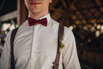 Когда свадьба назначена на жаркие летние месяцы и планируется на природе, то жених может отказаться не только от пиджака, но и жилета. В таком случае, главную роль в его наряде следует отдать подтяжкам. Именно на них он прикрепит свою бутоньерку. Свадебная мода допускает использование женихом подтяжек разного цвета и даже с нанесенными на них различными орнаментами.