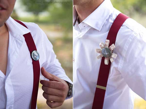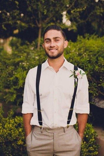 Когда жених решил не использовать пиджак, бутоньерка крепится на одну из подтяжек. Также можно закатать рукава рубашки, что сделает образ более мужественным.