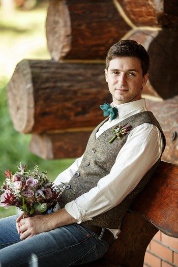 Если же невеста и сама предпочла удобство и комфорт, то тут уже фантазия жениха не сдерживается жесткими рамками. Непринужденный слегка небрежный наряд жениха на свадьбу, без пиджака, отлично смотрится в следующих тематиках свадьбы: