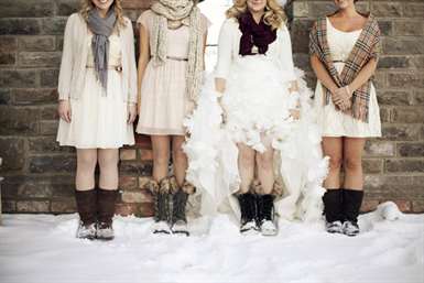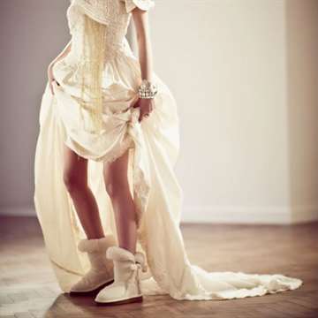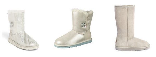 Для зимней прогулки идеально подходит обувь без каблуков. Австралийские сапожки Uggi — недорогой и универсальный вариант для обоих супругов. Причем в угги можно обуть всех гостей, что будет отличительной чертой вашей свадьбы. Кстати, австралийская торговая марка Ugg Australia уже приготовила целый ряд свадебных сапожек из белой, серебристой и золотистой замши. Видимо для того, чтобы ваши ножки весело отблескивали на зимнем солнце.