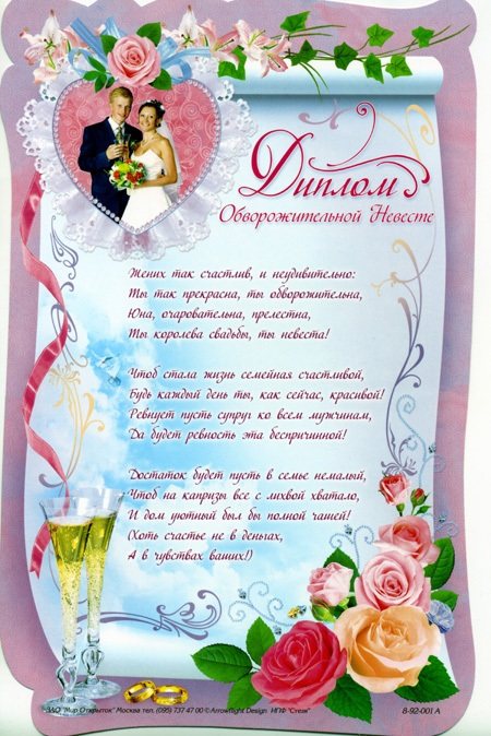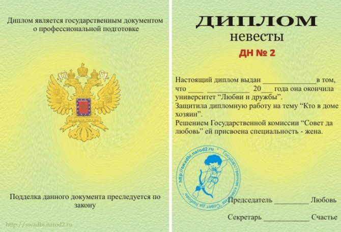 Диплом или сертификат. Его можно сделать своим руками или купить готовый. В этом «документе» перечисляются все достоинства и «заслуги» невесты. Стандартный диплом невесты изготовлен по образцу диплома или аттестата, и в нем написано, к примеру:«Диплом выдан Марии Петровой, окончившей с отличием университет Любви и Дружбы 15.15.2015 по специальности «Лучшая хозяйка в доме», решением специальной комиссии ей присвоена квалификация «Жена». Можно и без особых затей оформить аттестат виде рифмованного четверостишия, вроде: «Подтверждает аттестат, что невеста просто клад». Вариантов очень много — есть куда приложить фантазию и выдумку.