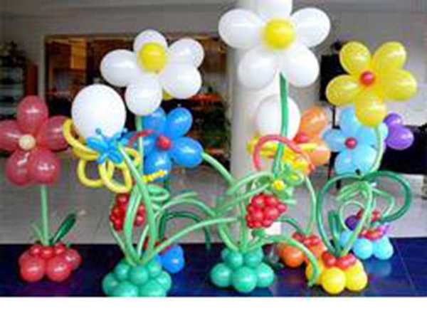 Интересный и изящный вариант оформления. Обычно они не превышают высотой два метра и полностью создаются из шаров разных форм. Стебли – из тонких шариков в форме «колбасок», цветы – из круглых и продолговатых.