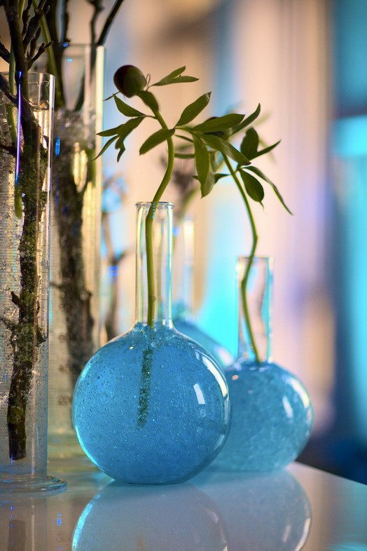 Очень модный тренд 2010 года в Европе — использование самодельных ваз для цветов. Необычные сосуды для цветов могут очень сильно удивить приглашенных гостей, а вам значительно сэкономить бюджет. Любую вазу можно покрасить. А можно вообще заменить вазы большими винными бокалами. И даже одинокий цветок, поставленный в такую посуду, будет смотреться очень свежо и модно.