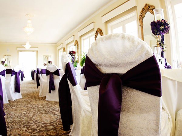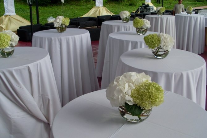 Обычно рестораны предоставляют скупое текстильное оформление. Белые чехлы на стулья и 1-2 варианта юбок на столы. Причем один из двух вариантов будет белый.