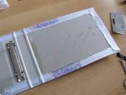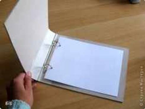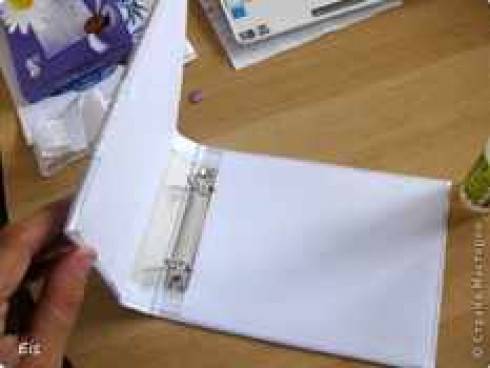 Для того чтобы материалы лучше фиксировались, с внутренней стороны папки надо снять верхнее бумажное покрытие, кроме области возле металлических зажимов.