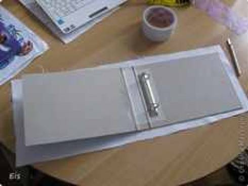 Первым этапом к изготовлению гостевой книги является подготовка папки. Необходимо определится с размером изделия. При помощи канцелярского ножа обрезать папку до нужной величины.
