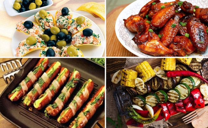 Салат с оливками на чипсах / крылышки барбекью / сосиски с беконом / овощи гриль: