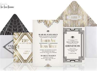 Пригласительные можно изготовить самостоятельно или обратиться за помощью к дизайнеру. Подходящим вариантом станут открытки золотистого цвета, украшенные кружевом, стразами, блестками, перьями и жемчугом. На титульной странице можно разместить фото главных героев фильма, стиль которого был положен в основу торжества.