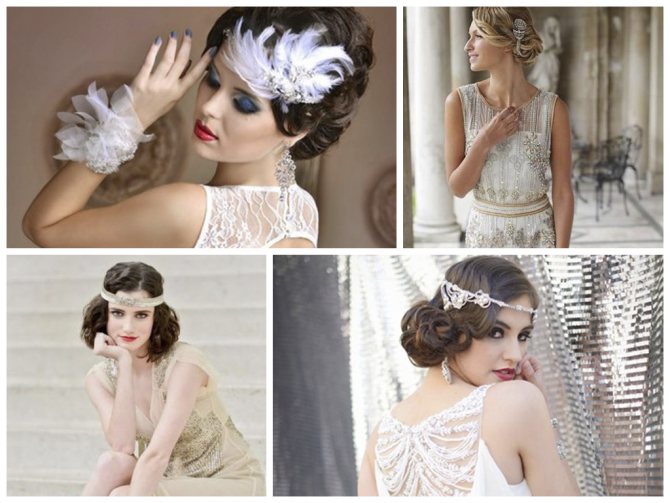 Вообще гладкость и блеск – основное правило, поэтому не жалейте фиксирующих и разглаживающих средств. Укладка обязательно должна быть дополнена украшением – лучше всего лентой, декорированной стеклярусом или бахромой. Сбоку добавьте крупное украшение – брошь, перо, цветок.