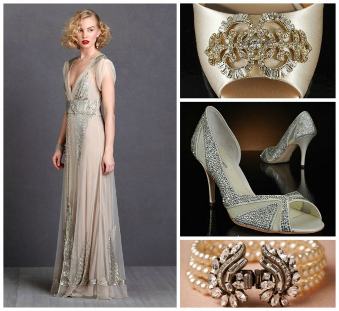 Для цвета платья выбирайте оттенки белого, но не белоснежные, а словно бы состаренные. Отличный вариант – бежевый, оттенок слоновой кости, шампань, серебристый, пудровый. В качестве декора используйте бахрому, стеклярус, стразы.