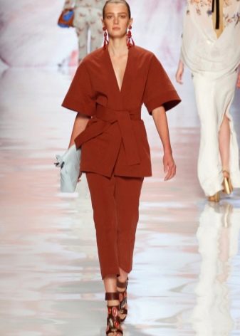 К японскому стилю в одежде относят одежду широких и прямых фасонов. Например, юбка-брюки свободного кроя, просторная блуза, прямое длинное или средней длины платье. Предполагается, что для пошива одежды используют преимущественно натуральные ткани – шелковые, льняные или хлопковые. Сейчас часто добавляют в одежду атласное плетение.