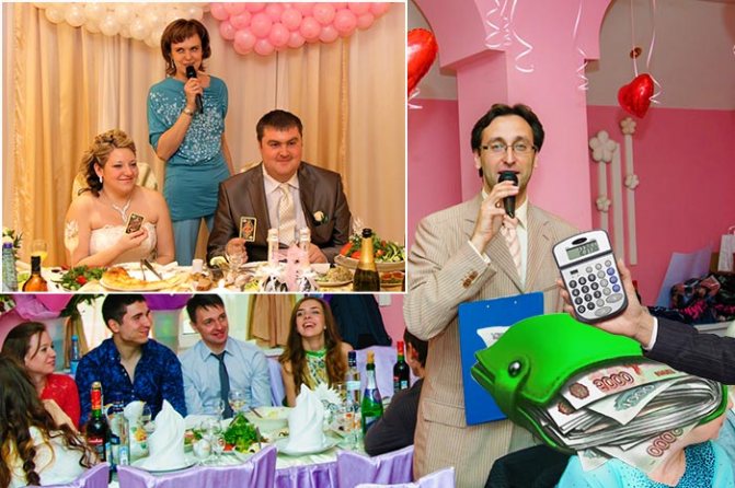В рамках сценария также проговорите организацию первого танца новобрачных, последовательность поздравления от родственников, проведение конкурсов с деньгами, маленькие подарки гостям и концовку торжества.